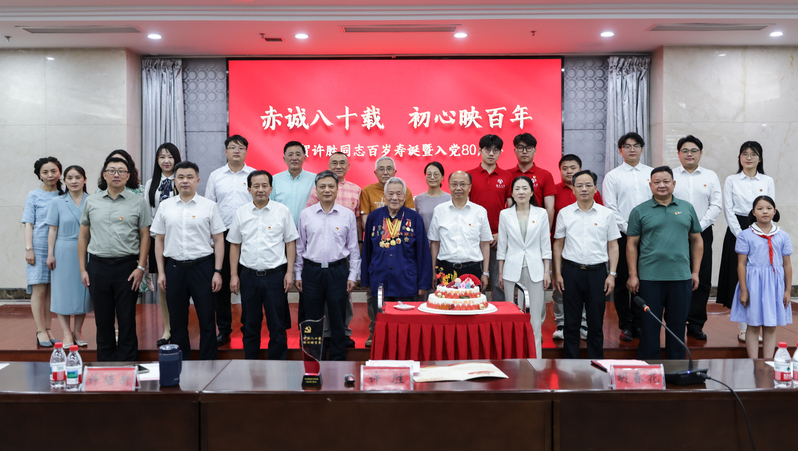 7月4日上午,我校为离休干部许胜举办百岁寿诞暨入党80周年政治生日庆贺活动。校党委书记杨宇民为许胜送上纪念奖杯,南通市委组织部副部长、老干部局局长、离退休干部工委书记周健,南通市退役军人事务局党组书记、局长周海斌分别送上政治生日贺卡与鲜花。校党委副书记王卫东带领全体党员重温入党誓词。校党委常委、组织部部长吴如高,校党委常委、宣传部部长陶锋出席活动。