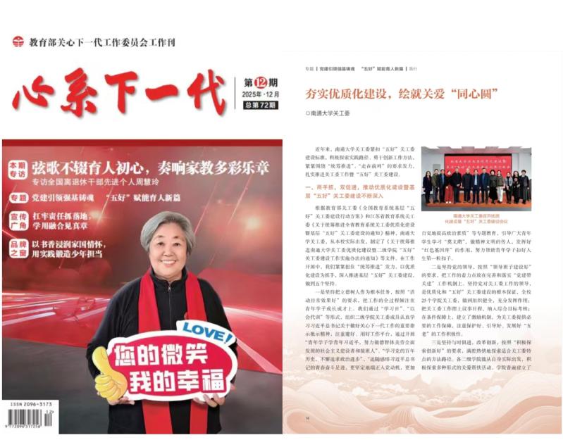 近日,教育部关心下一代工作委员会会刊《心系下一代》2025年第12期刊发了我校关工委《夯实优质化建设,绘就关爱“同心圆”》一文,系统展示了我校关工委围绕全国教育系统基层“五好”关工委建设标准,紧扣“统筹推进、走在前列”工作要求,持续深化实践探索、推进工作创新、提升“五好”创建质效的积极作为。